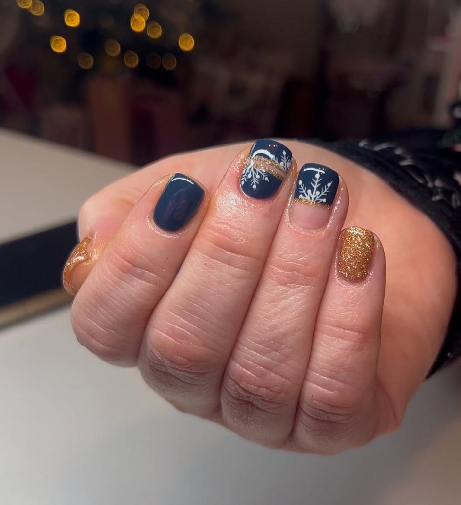 This manicure is a chic take on holiday nails, deep navy polish meets golden glitter with delicate snowflake designs. The rich contrast is modern yet cozy, perfect for holiday dinners or winter weddings.
