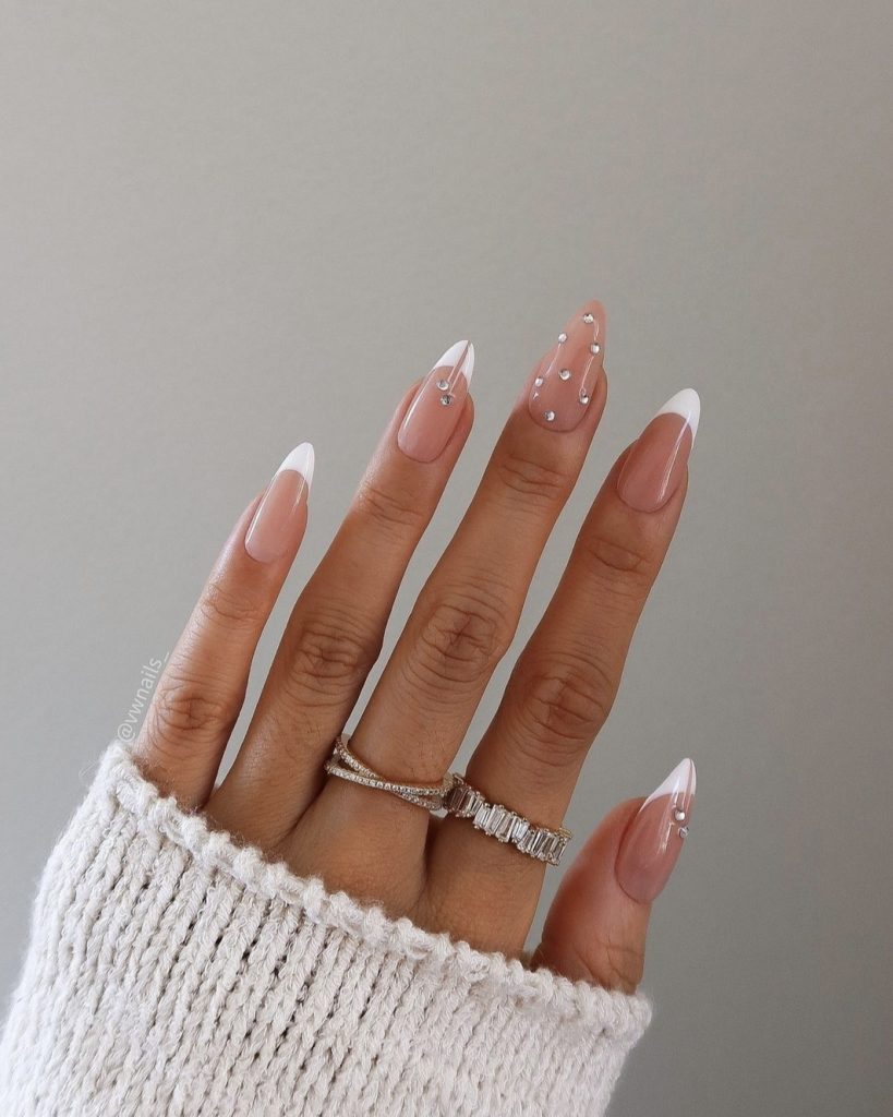 Sometimes, understated nails make the biggest impression. These almond nails feature crisp French tips with tiny pearl accents, creating a soft, refined design that feels both festive and elegant.