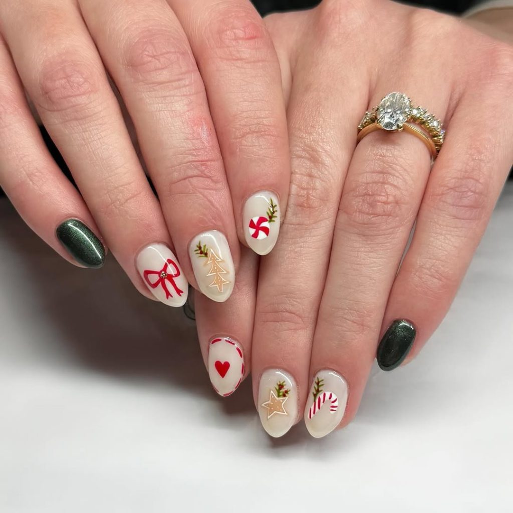 This manicure is like the fun side of Christmas, with candy canes, bows, hearts, and stars all descending on it together. Against creamy white and dark green bases, the nails maintain a level of playfulness that is still very elegant in tone.
