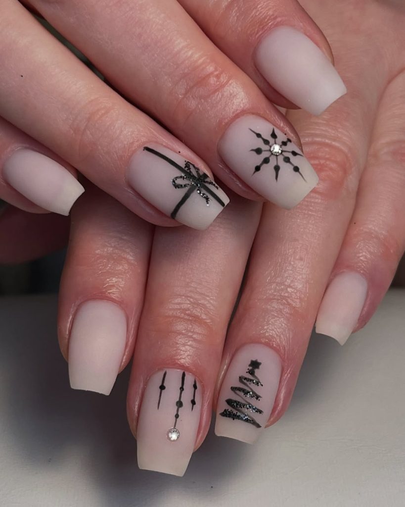 Minimalist but never boring, this short square matte nude manicure has just the right amount of holiday spirit. With tiny black designs of ribbons, ornaments, and a Christmas tree, the nails carry a classy modern vibe that works well for both office parties and New Year’s Eve celebrations.