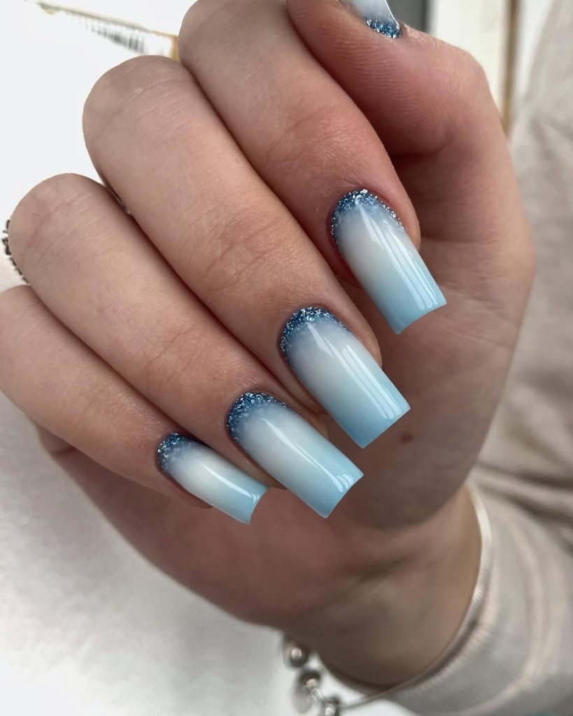 This is the kind of manicure that would make anyone think of those winter mornings. A soft ombré finishes from white to blue, with glittery cuticle accents that mimic the icy frost. This dreamy and magical rendition of holiday nails will complement well with silver jewelry or a cozy pale-blue sweater.