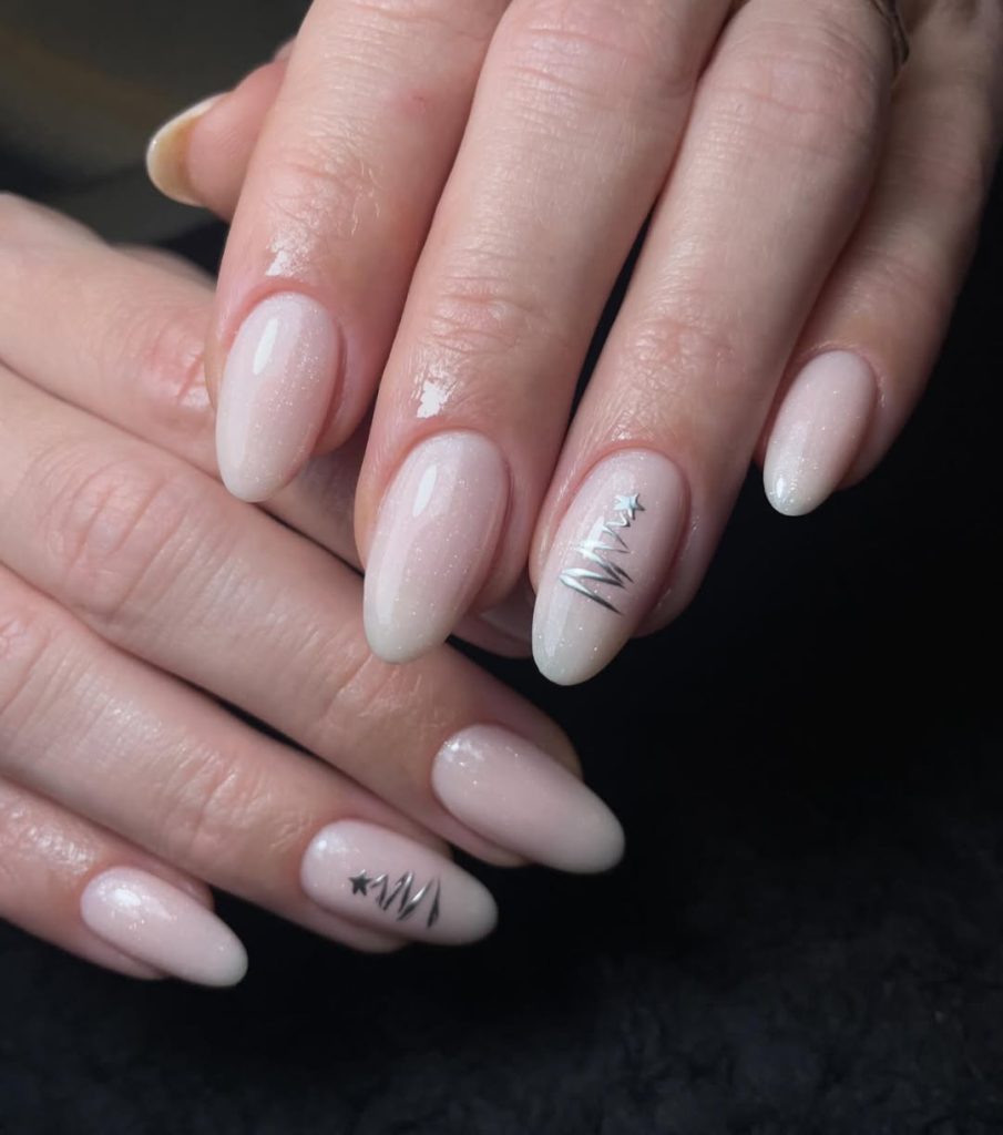 If you are into understated holiday nails, then this almond manicure is just perfect. The soft nude base with a light shimmer served as a perfect backdrop for the minimalist silver tree designs. It really feels festive but retains that refined, polished appearance.
