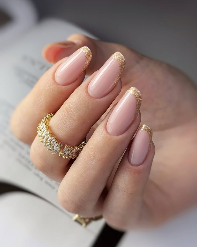 This design is undeniably classy and sophisticated, yet it remains beautifully simple. The nude base is timeless, while gold glitter gives enough detail to sparkle but remains decorative. This design is gorgeous in the little, delicate moments—like when you are turning a page in a book or resting your hand on a table.