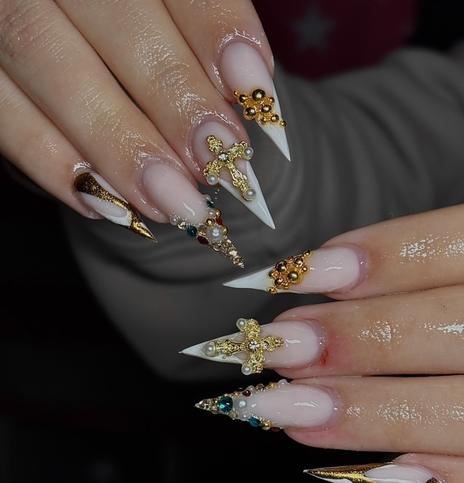 Unapologetically and carefully styled dramatic nails. The soft pink base is refreshing, while gold nail art on the tips and embellishments is fabulous and extravagant. There’s a sense of bold femininity here with a mixture of glam and power. Purposefully designed to make a statement.