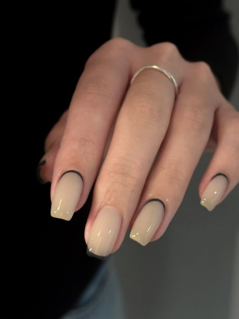 This design feels modern, confident, and a little unexpected. The soft beige base keeps the look neutral and wearable, while the thin black outline adds a graphic edge that feels deliberate and stylish. It’s minimal but not boring—a manicure that feels very fashion-forward while staying clean and composed.