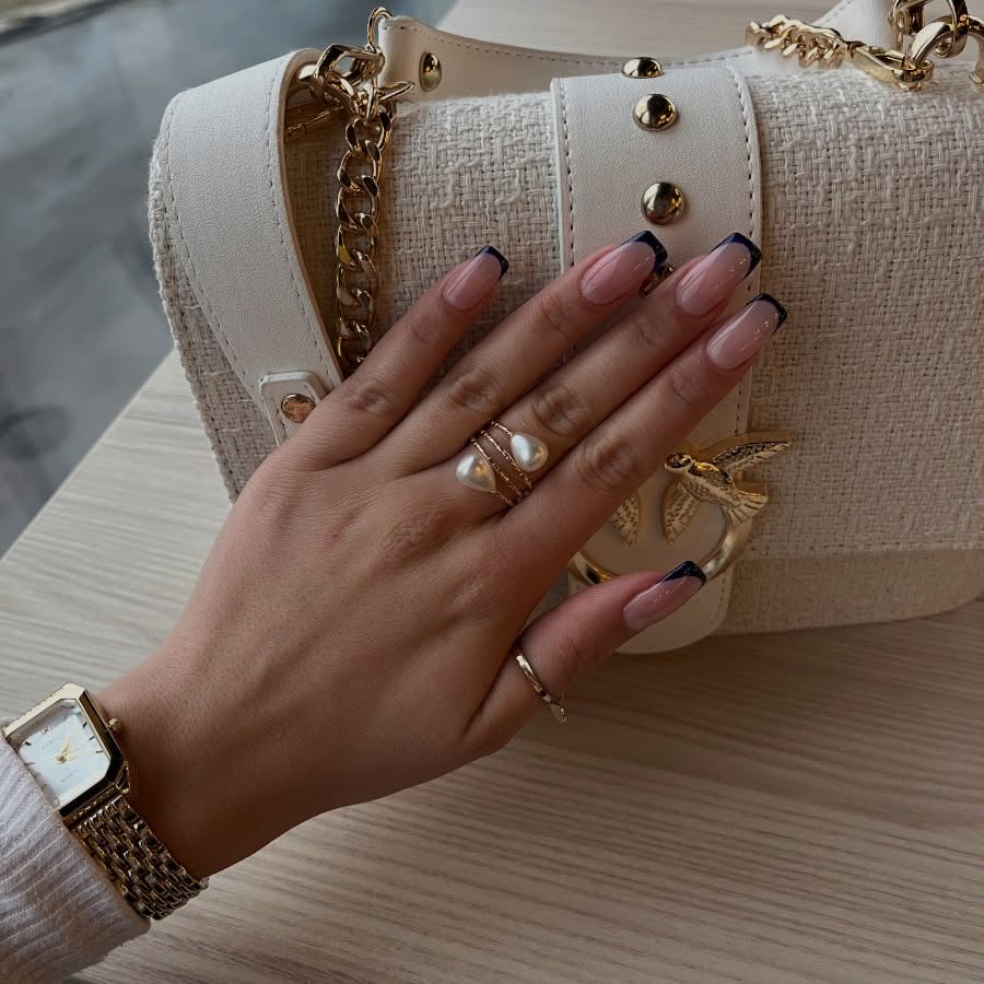 This manicure feels like quiet confidence with a modern edge. The soft pink base keeps everything gentle and feminine, while the black French detail adds a graphic contrast that feels intentional and stylish. It’s the kind of look that reads polished from every angle—subtle enough for everyday, yet striking when you notice the details. There’s a refined balance here between softness and strength, which makes it feel very grown-up and fashion-aware.
