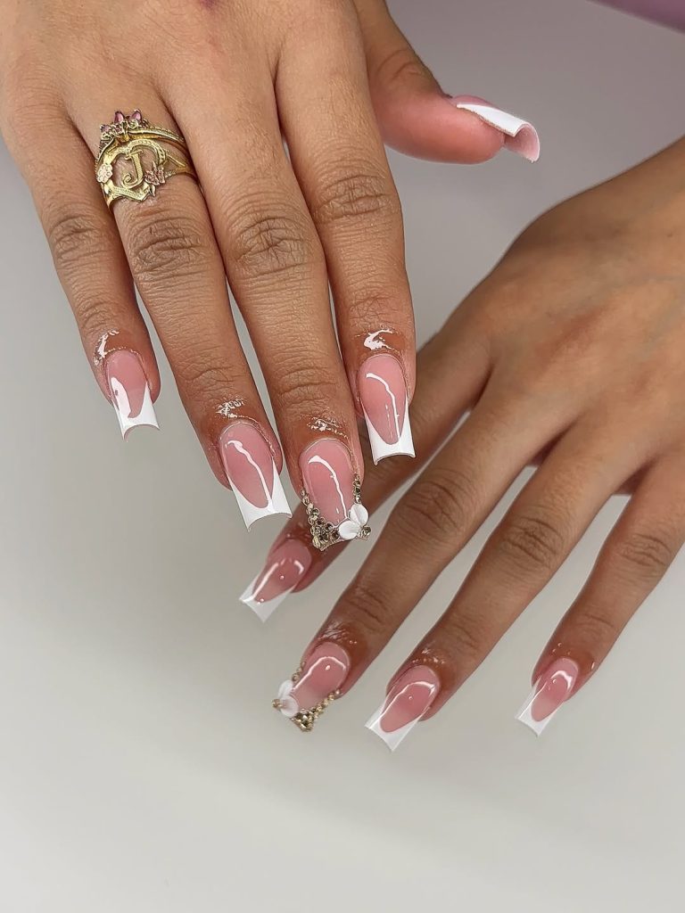 There’s a luxurious softness to this manicure that feels very intentional. The pink base and white French tips create a classic foundation, while the small gold charm adds a refined decorative touch. It feels elegant and feminine, with just enough detail to make it memorable without overwhelming the look.