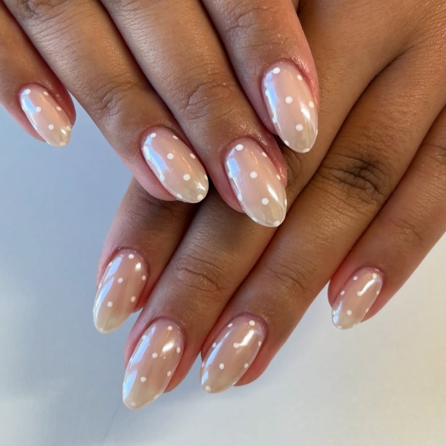 This manicure feels playful in the most refined way. The nude base keeps the look calm and elegant, while the tiny white polka dots add charm and personality. It’s light, feminine, and a little nostalgic—proof that simple art can still feel grown-up and stylish.
