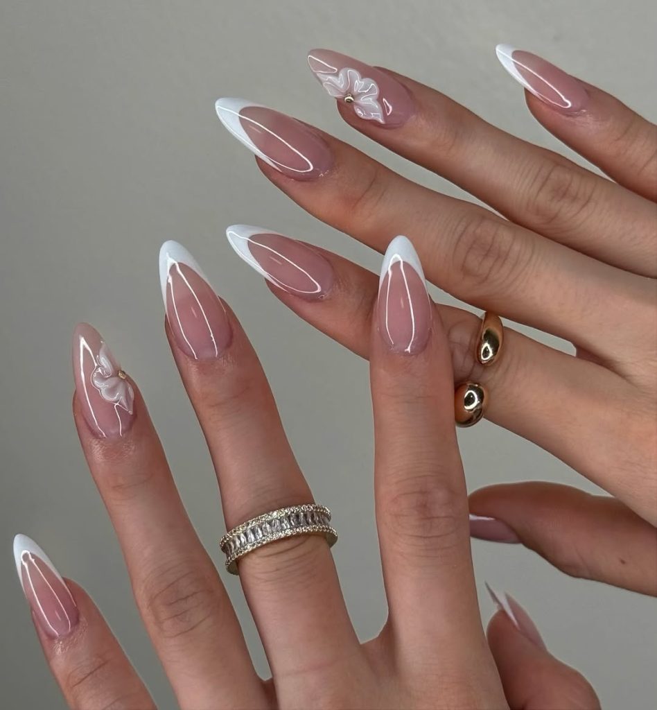 This manicure works wonderfully for long almond nails, especially if you love refined designs with a single artistic detail. The floral accent keeps the look fresh while preserving a clean overall finish. It’s a lovely inspo choice for special occasions or whenever you want your nails to feel thoughtful and feminine.