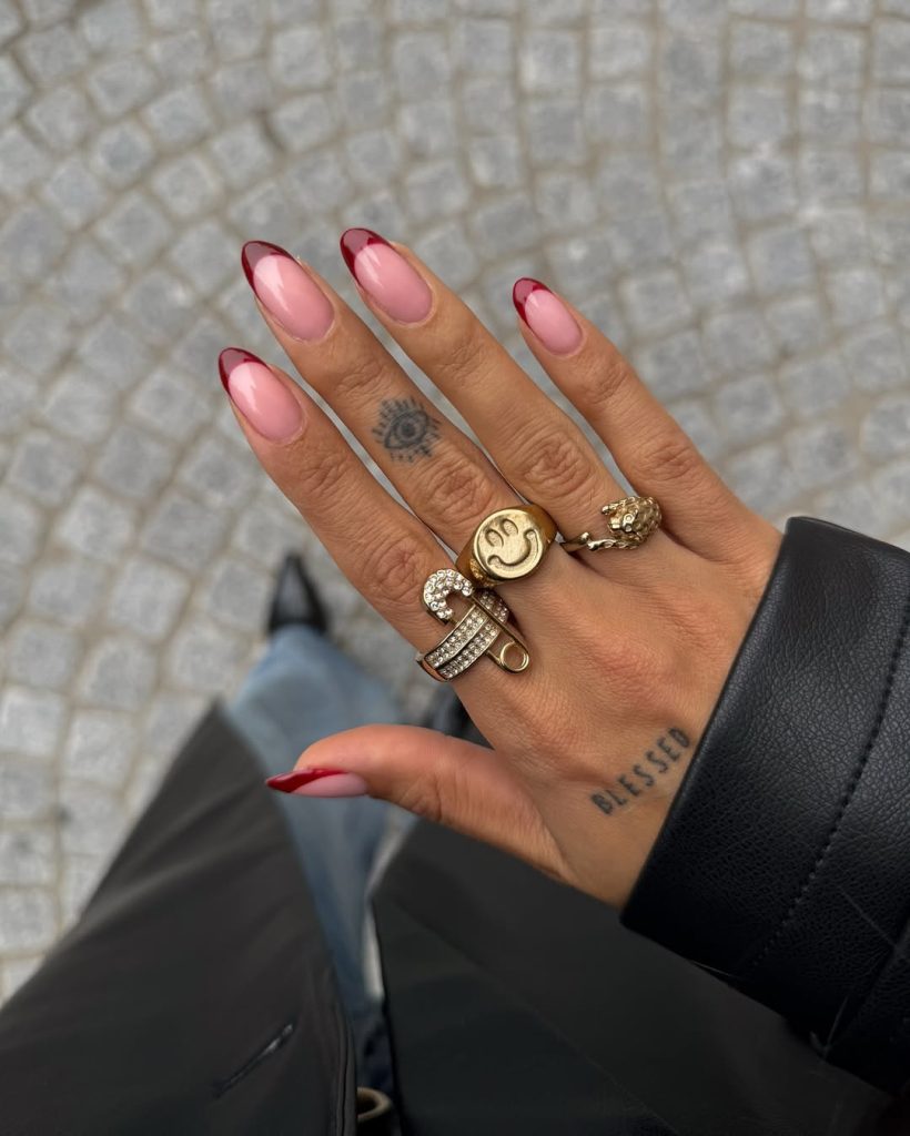 This manicure has confidence written all over it. A soft pink base keeps things feminine and clean, while the deep red French tips add just enough drama to feel bold without going flashy. The almond shape elongates the fingers, and the crisp contrast gives these nails a fashion-forward attitude that feels intentional and chic. It’s the kind of look that turns heads quietly—stylish, grown-up, and undeniably cool.