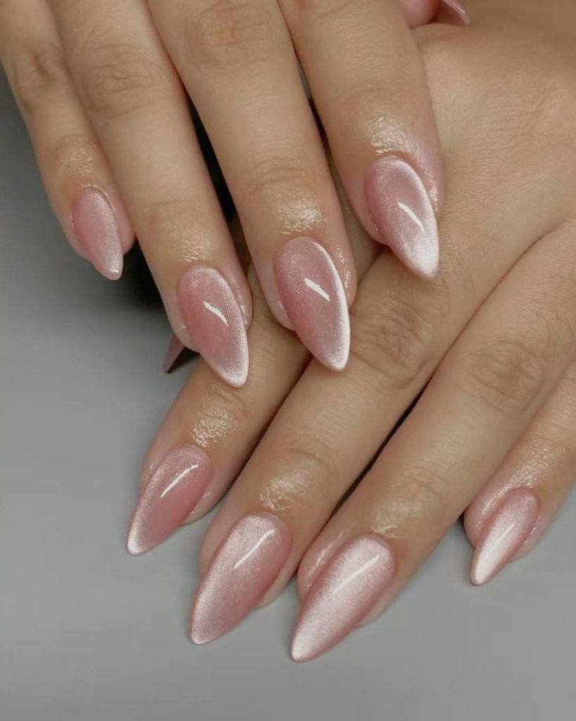 This manicure works beautifully for long nails and is especially flattering if you enjoy subtle texture rather than bold art. The shimmer catches the light softly, making it a lovely choice for evenings or special moments while still being wearable during the day. It’s a wonderful idea if you want something elevated that doesn’t rely on strong colors or heavy embellishments.