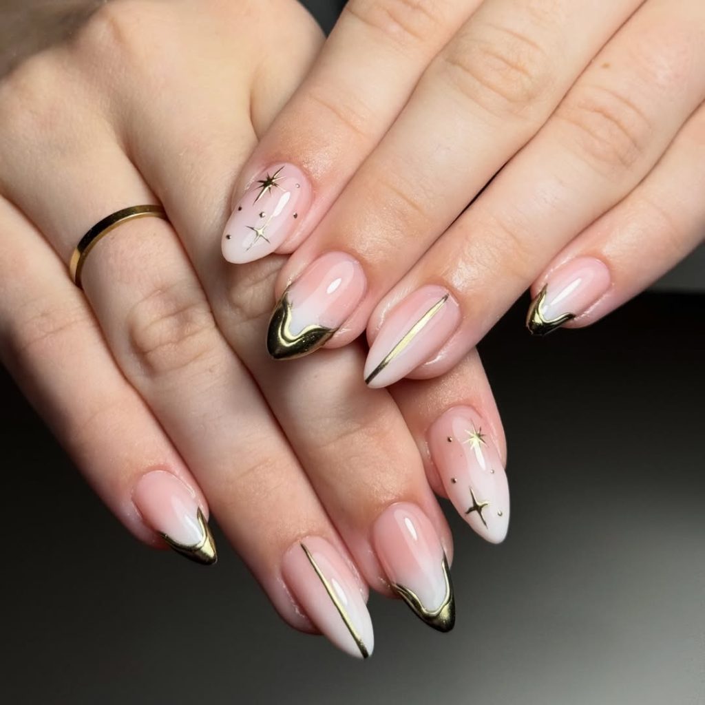 It perfectly captures almond nails and subtle design appreciation. Gold detailing keeps the design balanced and clean. This design is perfect if you want your nails to feel elevated without looking overdone. Great for events, going out, etc.