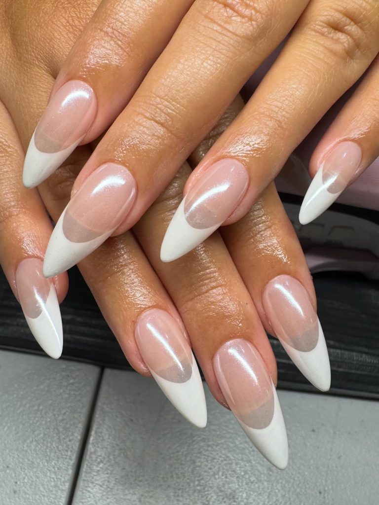 This look feels fresh, confident, and unapologetically chic. The sharp stiletto shape adds drama, but the white French design keeps everything grounded and refined. There’s a beautiful contrast between softness and strength here—clean lines, a glossy finish, and a silhouette that feels bold yet controlled. It’s modern elegance with an edge, perfect for women who know exactly what they like.