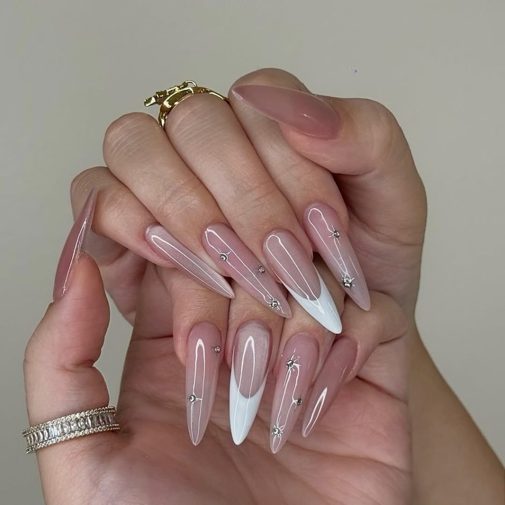 There’s a soft glamour to this look that feels almost effortless. The sheer pink base and white French tips create a classic foundation, while the tiny crystal accents add a whisper of sparkle rather than a statement. It feels romantic, light, and refined—the kind of manicure that quietly elevates your whole look without demanding attention. Everything about it feels intentional and graceful.