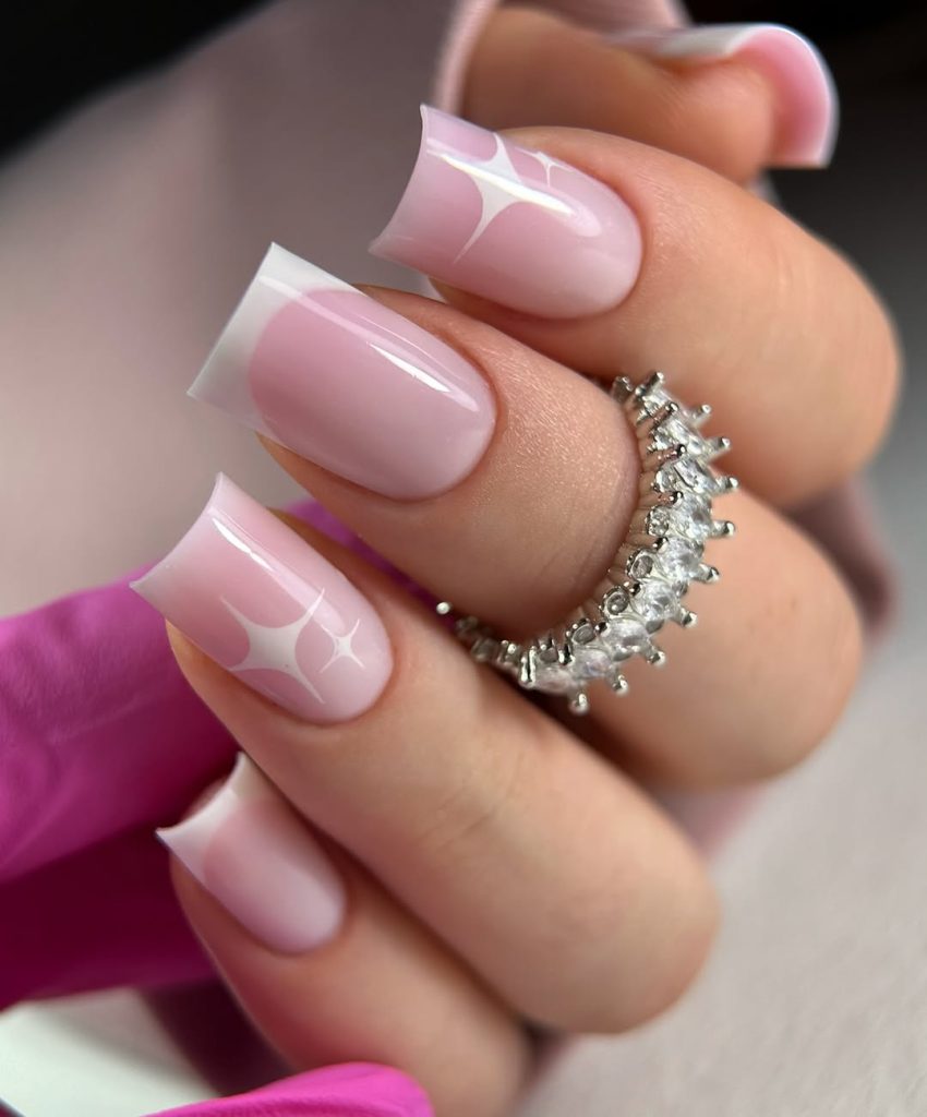 This manicure feels fresh, modern, and quietly confident. The soft pink base keeps the look approachable, while the crisp white French tips and graphic lines add a contemporary twist. Square nails give the design structure, making it feel clean and intentional rather than delicate. It’s a look that feels very “”now”—stylish without being trendy, and polished without being fussy.