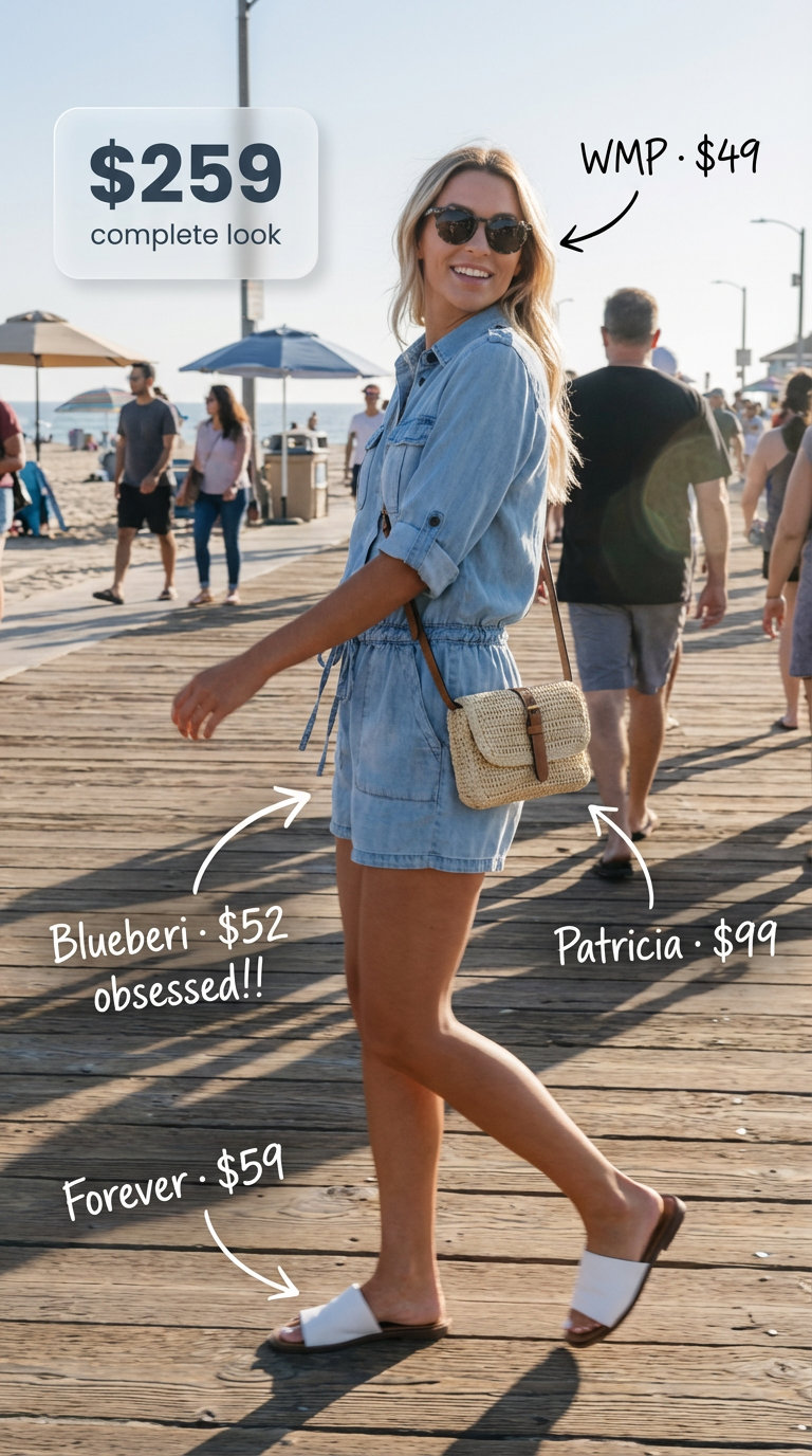A light blue chambray Blueberi B romper with a drawstring waist creates an effortlessly chic foundation for beach days and poolside brunches—the customizable drawstring ensures a flattering fit across different body types. Cream leather slides in white provide easy on-off convenience while maintaining the relaxed-yet-refined aesthetic. A natural straw crossbody bag adds vacation authenticity and keeps hands free, while tortoiseshell polarized sunglasses serve double duty: protecting eyes and completing the look. Polarized lenses effectively reduced glare from water during beach time, improving visibility while the acetate frames stay comfortable during extended wear. The cohesive palette of light blue, crisp white, and warm tan feels serene and Pinterest-worthy without requiring any overthinking.