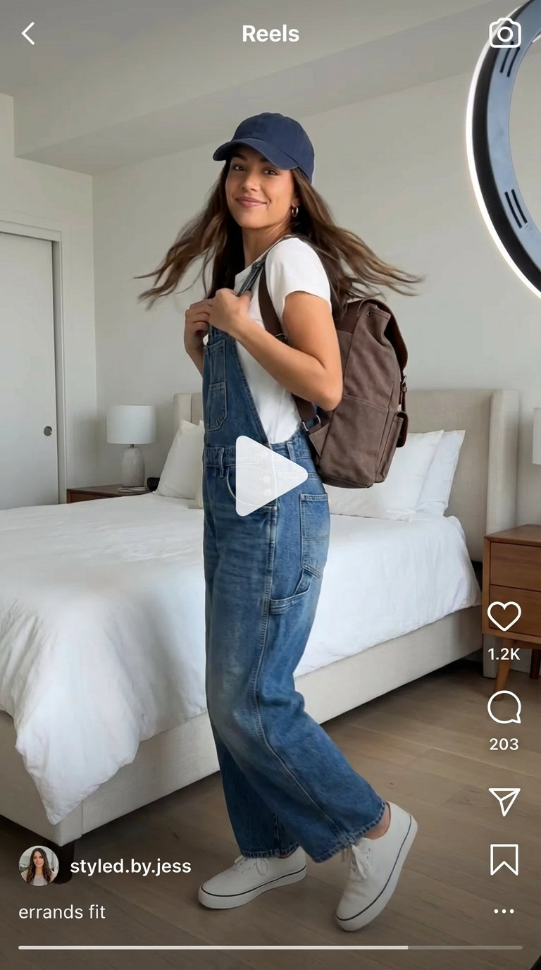 Medium blue denim overalls are the playful anchor for errands, outdoor activities, and low-key days when you want an outfit that feels effortless and youthful. The loose fit and front pockets deliver genuine utility alongside style—overalls actually hold things. A crisp white tee layers underneath naturally, while canvas sneakers in white provide breathable support for walking. A brown canvas backpack with faux leather accents carries essentials hands-free, and a navy baseball cap ties the color story together with sporty charm. The combination of medium blue denim, crisp white, and warm brown creates a fresh, classic palette that feels both nostalgic and current.