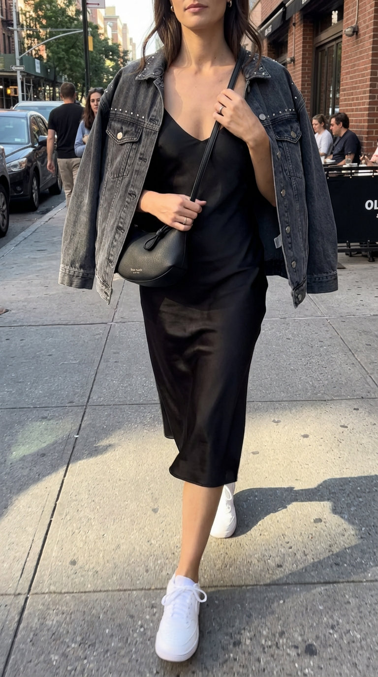 Cool, relaxed, and undeniably urban—this look layers an oversized studded denim jacket over a sleek black slip dress with white sneakers, creating that effortless evening energy perfect for outdoor concerts or casual dinners. The medium wash cotton denim jacket drapes naturally, while the polyester satin slip dress provides a clean, sophisticated base. White canvas sneakers complete the vibe with understated cool.