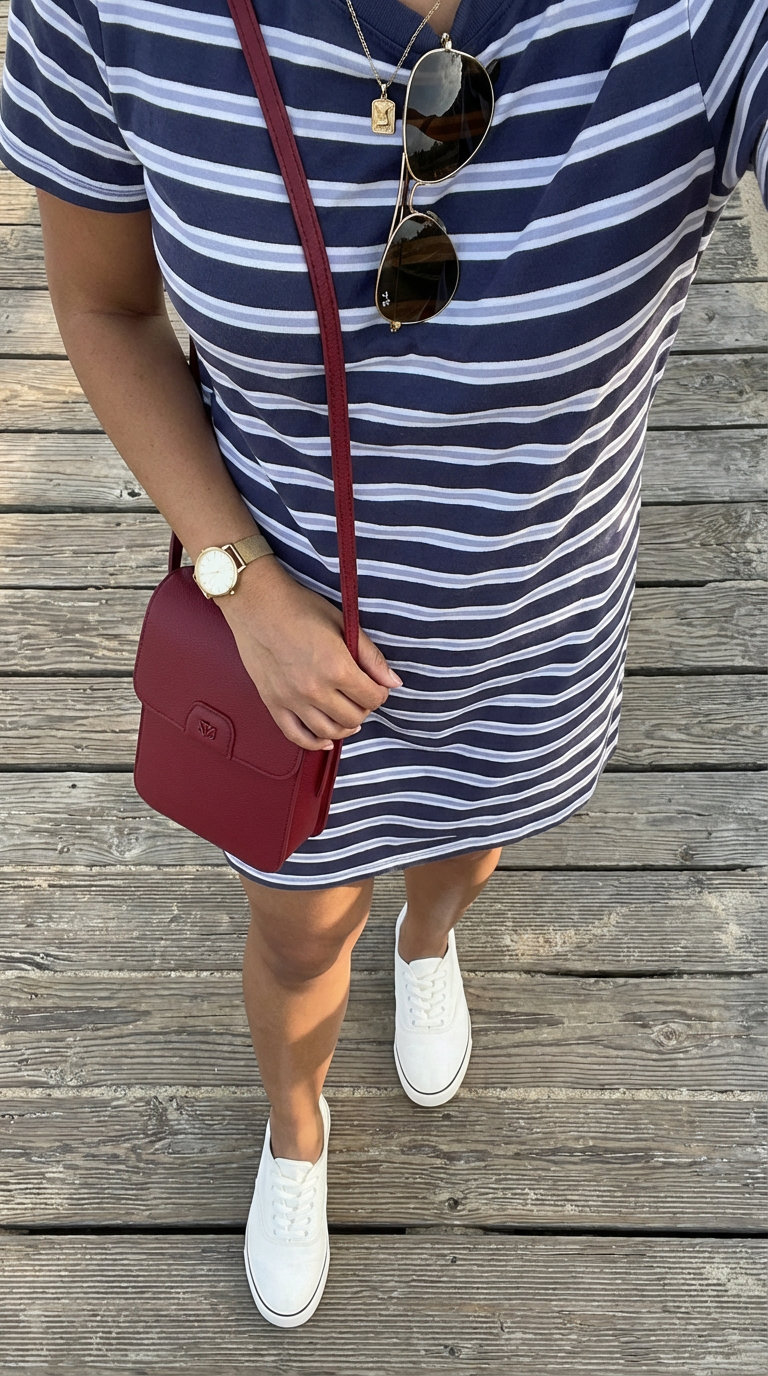 Classic nautical style meets boardwalk comfort in this $12.49 Old Navy striped dress—the hero piece that anchors the entire look. The cotton jersey fabric breathes beautifully in warm weather, essential for extended time outdoors. A vibrant red crossbody bag at $23.97 pops against the navy-and-white palette, while white canvas sneakers at $17.49 deliver the sporty-yet-chic touch that makes walking effortless. Gold-framed aviator sunglasses complete the timeless aesthetic. Total investment: $53.95.