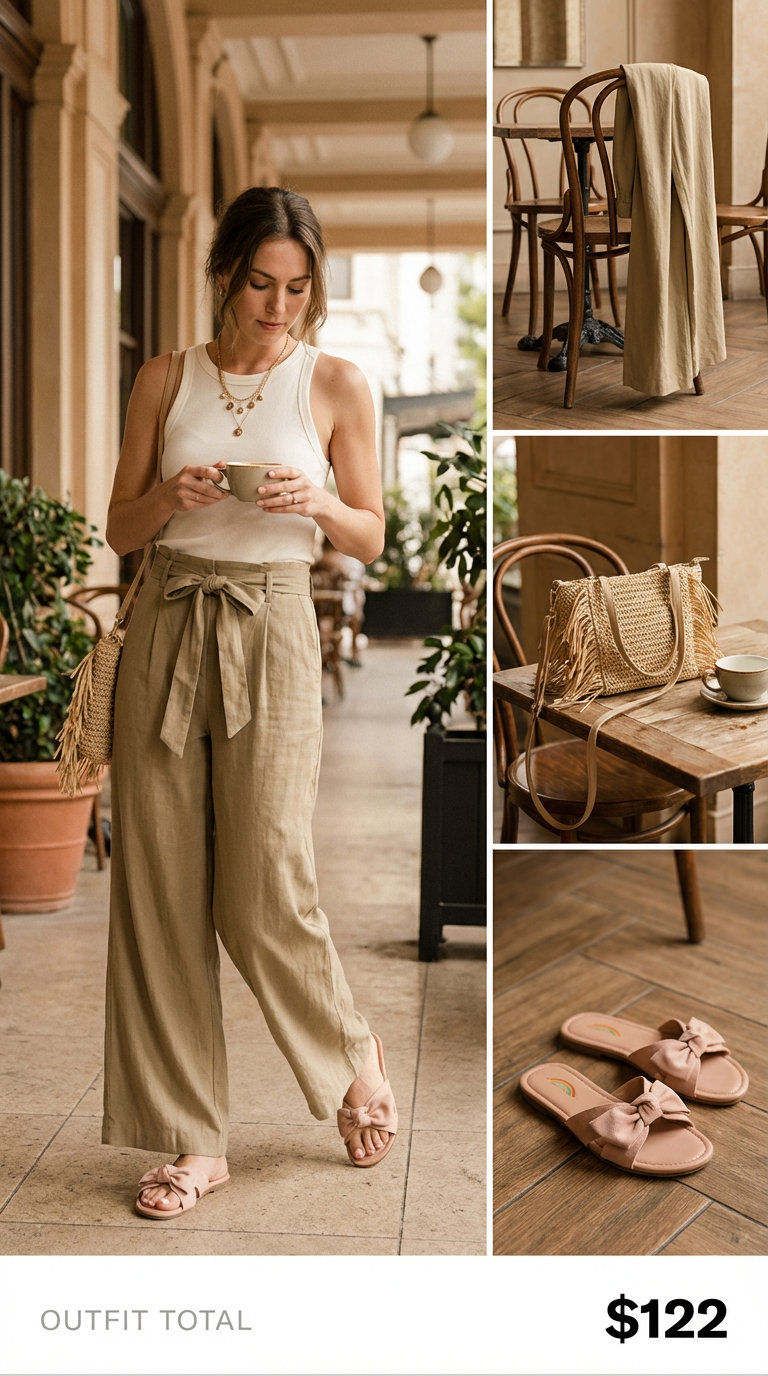 The hero of this outfit is a linen-blend high-waisted palazzo pant in khaki that anchors the entire look with effortless flow and breathability. Priced at $35.99, the wide-leg silhouette pairs perfectly with a crisp white cotton-knit tank top tucked fully at the waist for definition, creating a polished yet relaxed aesthetic perfect for weekend outings. A natural beige straw crossbody tote with faux leather straps completes the trio at $28. Together, the outfit totals $84.64, combining three essential pieces that work across casual brunches, sightseeing, and vacation days.