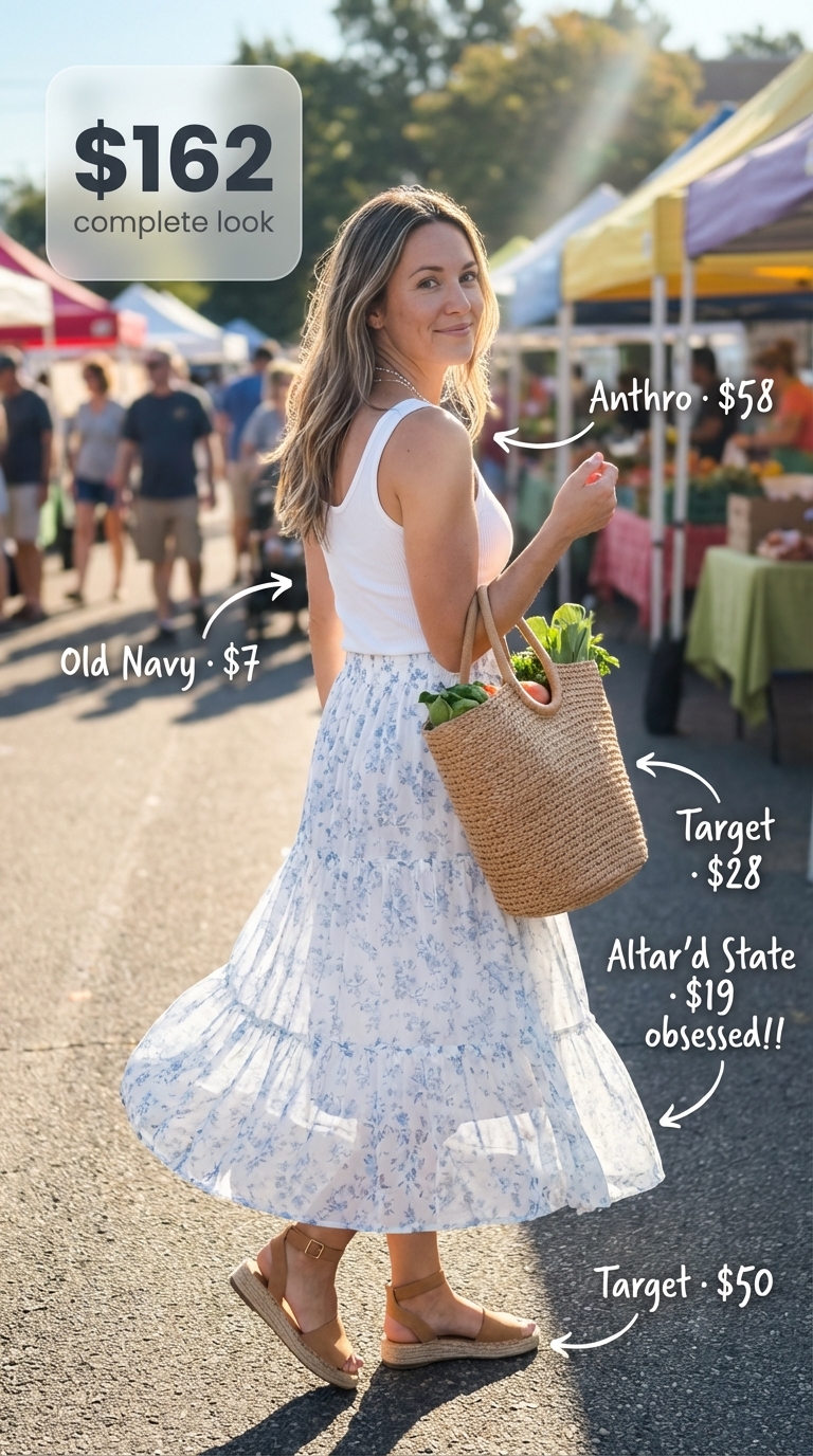 Boho chic perfected emerges in this four-piece ensemble anchored by an Altar’d State floral maxi skirt in rayon, featuring soft whites with blue and green botanical prints at $18.99. The tiered design adds movement and bohemian charm while the rayon fabric drapes elegantly for a feminine silhouette. A crisp white tank top from Old Navy at $7 provides the foundational layer, tucked fully into the waistband to define the waist and balance the skirt’s volume. Natural tan canvas-and-jute espadrille ankle-strap sandals at $49.99 offer comfortable, stylish support for navigating farmers’ markets and outdoor venues. A delicate gold-plated crystal necklace at $58 adds subtle shimmer without overwhelming the neckline. The complete look totals $133.98, creating an effortless, feminine, and cheerful aesthetic perfect for summer outings.