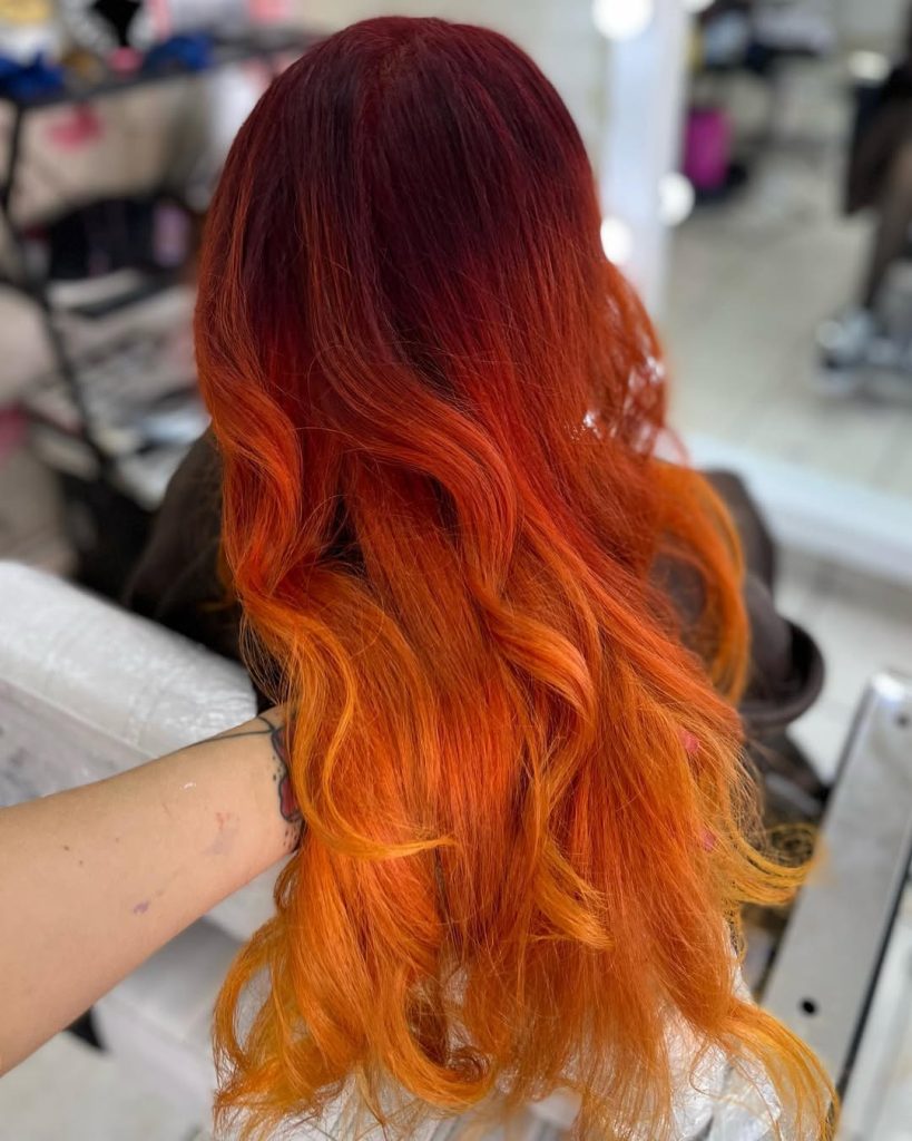 A color that resembles a summer sunset is undeniably captivating. This bold blend moves from a deep Red near the crown to glowing orange tones through the mid-lengths and ends, creating a warm, fiery cascade that feels full of energy. The gentle waves soften the intensity just enough, giving the color movement and personality rather than making it feel overly dramatic. It’s the kind of look that makes you feel instantly more adventurous—like you’ve just stepped into a new chapter of personal style.