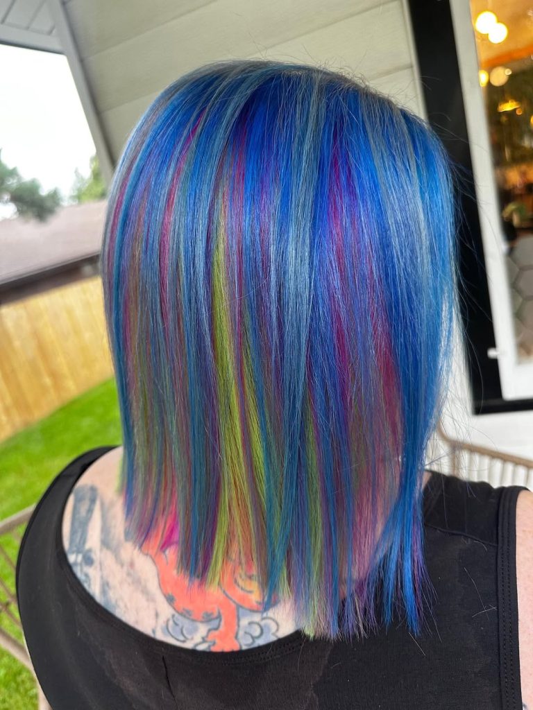 At first glance, the rich Blue base immediately steals the spotlight, but look a little closer and you’ll notice playful flashes of Purple, Green, and Pink woven through the strands. The colors appear like streaks of light hidden inside the hair, revealing themselves as the hair shifts. The straight cut keeps the shape clean, allowing the rainbow-like tones to feel artistic rather than chaotic.