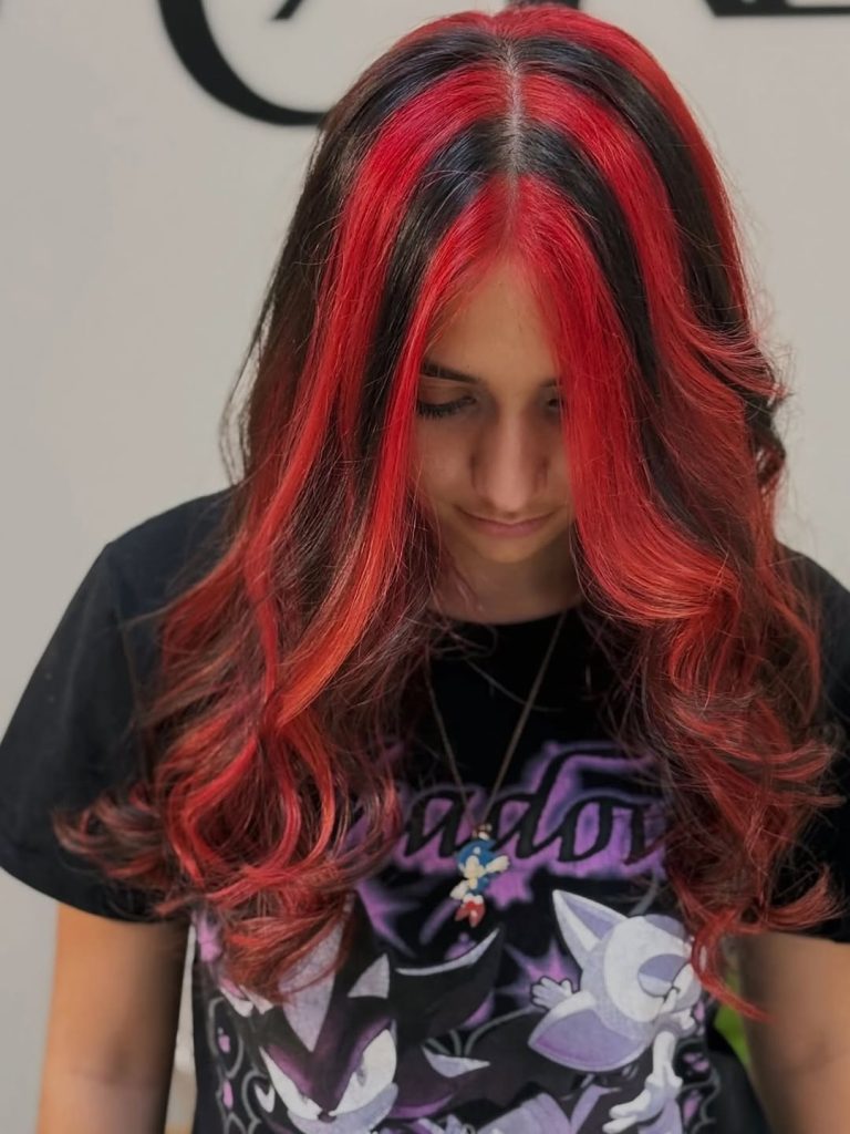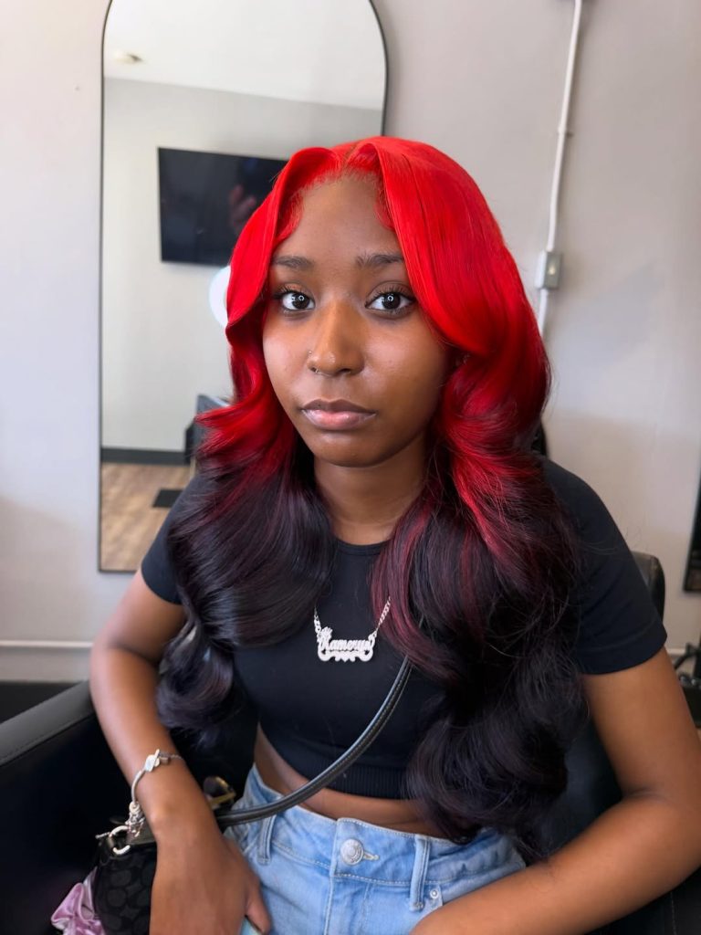 There’s something instantly striking about the vivid Red section framing the face. This bold color placement creates a glowing halo effect through the front layers, while the deeper base shade provides contrast and balance. The flowing waves soften the dramatic tone, giving the hair a glamorous, almost cinematic quality that feels both modern and edgy.
