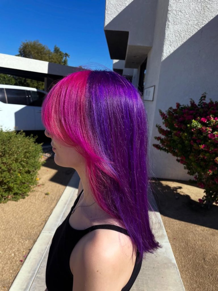 This bold Split design offers a hair color that embodies pure creative freedom. One side glows with vibrant Pink while the other flows into rich Purple, creating a dramatic contrast that somehow still feels harmonious. The sleek texture lets the Colors shine with almost glass-like intensity, while the smooth layers soften the look so it doesn’t feel too harsh. It’s playful, artistic, and impossible to ignore—the kind of hairstyle that instantly becomes the centerpiece of your entire look.