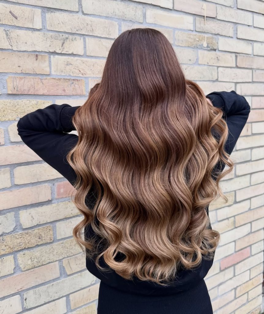 Few color combinations feel as effortlessly luxurious as soft honey-brown tones melting through flowing waves. The gentle transition between deeper Brown roots and warm golden ends creates a luminous effect that looks incredibly natural. Each wave catches the light slightly differently, giving the hair movement, glow, and that polished “just left the salon” finish.