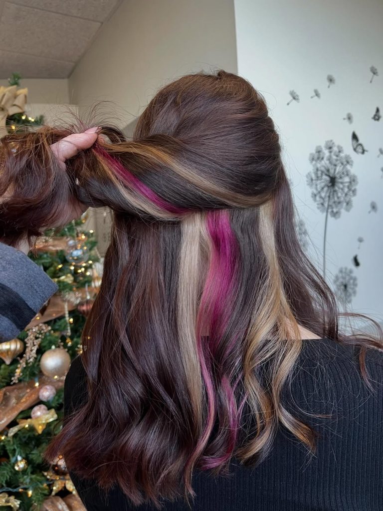 At first glance, this haircut looks like a beautifully blended brunette with soft Blonde highlights. But the moment the hair moves, a vibrant Pink streak appears underneath, adding a playful secret to the style. It has a color detail that seems subtle during the day but is surprisingly bold when the hair is styled in waves or half-up looks.