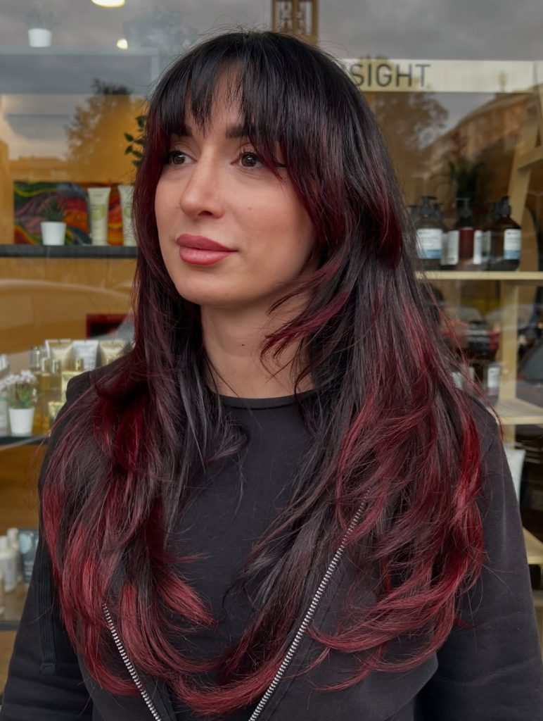 There’s something undeniably captivating about the drama of rich Red paired with deep Black. The vibrant red layers sweep across the crown like a burst of energy, while the darker underlayers peek through the ends, creating a striking contrast that feels edgy yet sophisticated. With feathered movement and soft flips at the ends, this look has that slightly rebellious charm that turns a simple layered cut into a full personality statement.