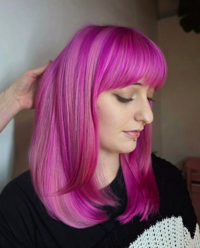 This vibrant Pink hair color is undoubtedly one that defies subtlety. The shade feels joyful, rebellious, and unapologetically fun, especially when paired with a soft curly texture and a blunt fringe that frames the face with attitude. There’s something wonderfully confident about a color like this—it’s playful but powerful at the same time. Instead of blending quietly into everyday shades, this bold tone makes every curl feel like a little spark of personality.