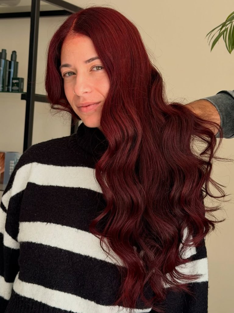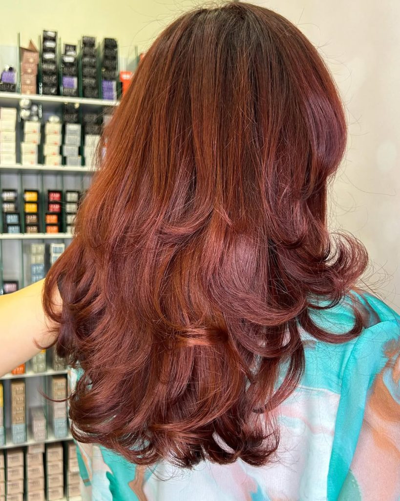 Rich Red hair has always carried a certain timeless glamour, and this shade is no exception. The color flows through long, soft waves, like velvet, catching the light, revealing subtle Brown undertones that add warmth and depth. It’s bold without being flashy, elegant without feeling overly styled—a shade that feels both classic and modern.