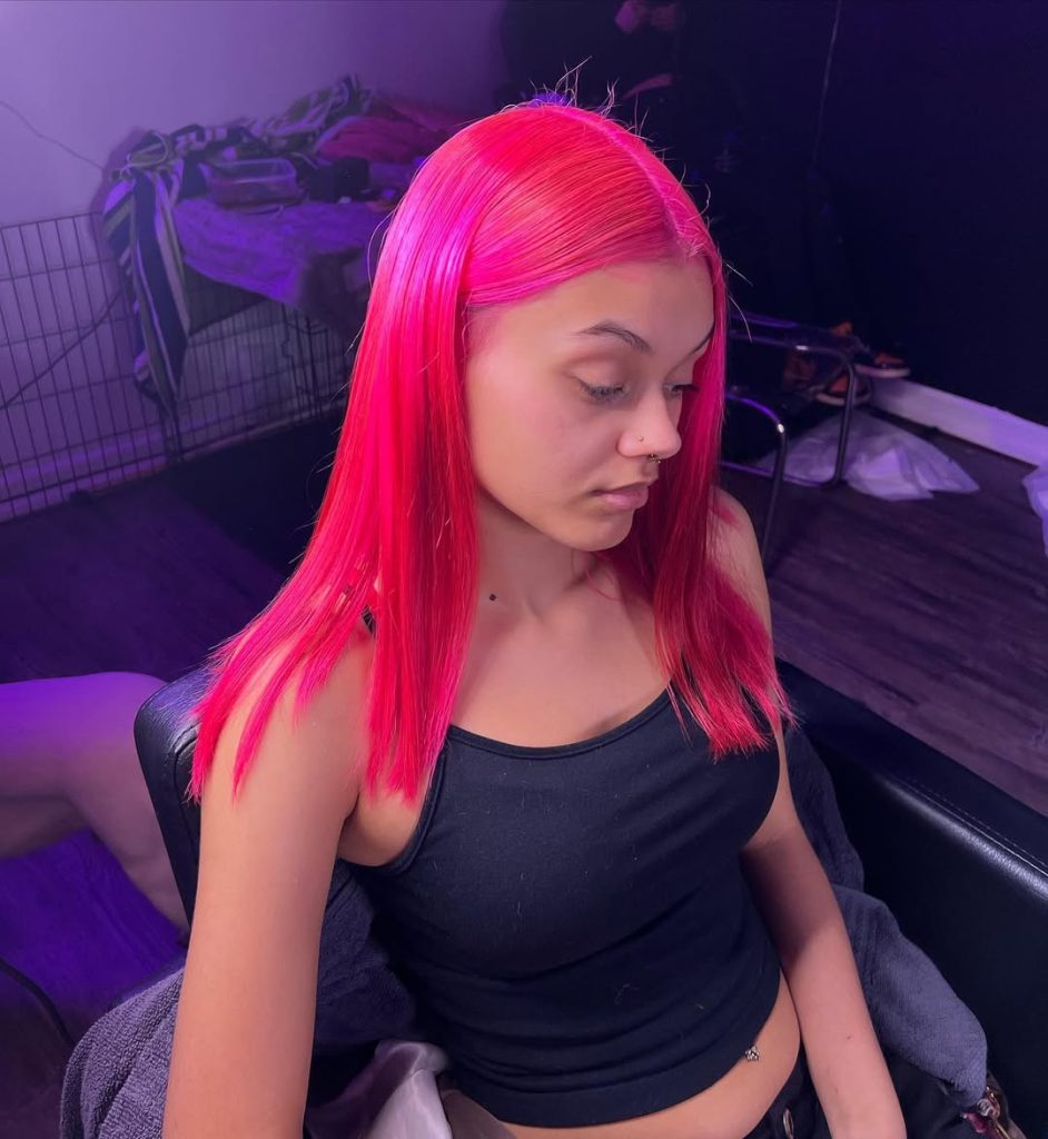 This vibrant Pink hair color is bright, unapologetic, and impossible to ignore—it embodies pure confidence in motion. The sleek, straight finish makes the shade appear even more intense, almost glowing under the light. Instead of relying on complicated color blends, the solid tone creates a bold statement that feels modern and fearless. It’s the kind of look that turns a simple haircut into a full fashion moment.