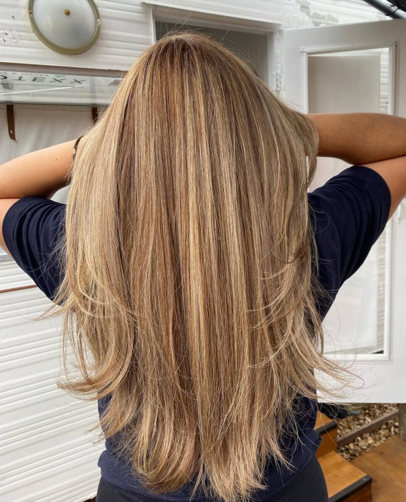 There’s something effortlessly luxurious about honey- brown tones cascading through long, layered hair. The color sits perfectly between Blonde and Brown, creating warmth without looking overly golden. Each layer catches the light slightly differently, giving the hair a soft glow that feels natural and polished at the same time. It’s the kind of color that quietly elevates your entire look without needing dramatic contrast.