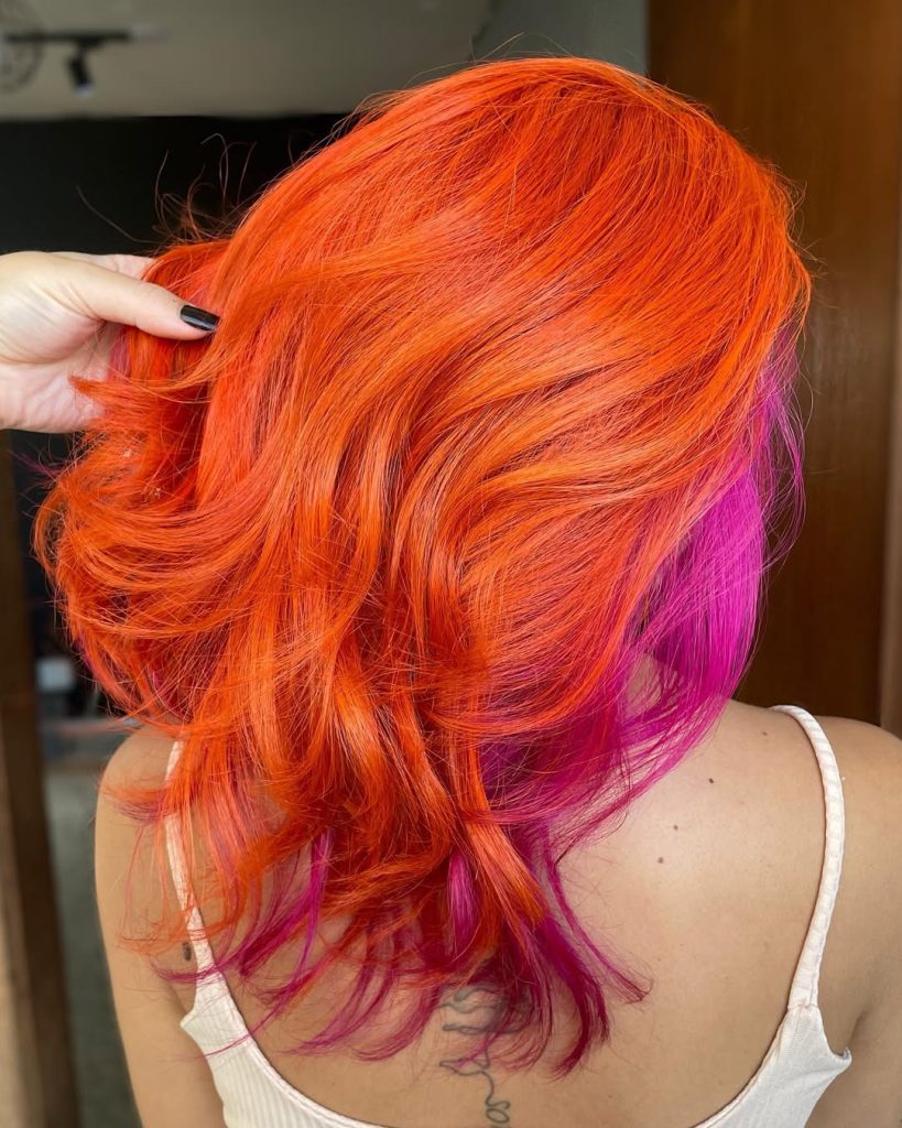 The magic of this look lies in the under-color placement ideas. By placing the Pink beneath the orange layers, the color becomes a surprise detail that reveals itself with movement or styling. Loose waves or soft curls help showcase both tones, making it especially flattering for medium to thick hair. Among daring color Ideas, this layered approach keeps the look bold yet wearable.