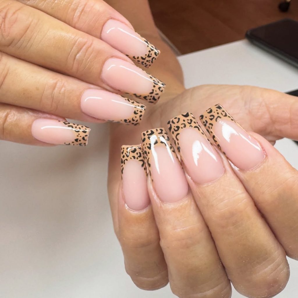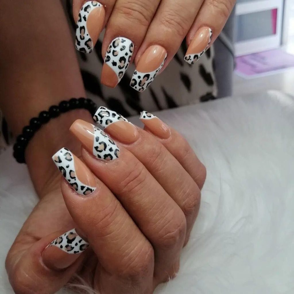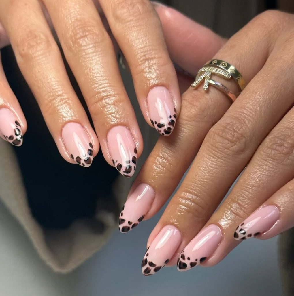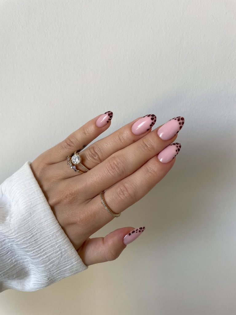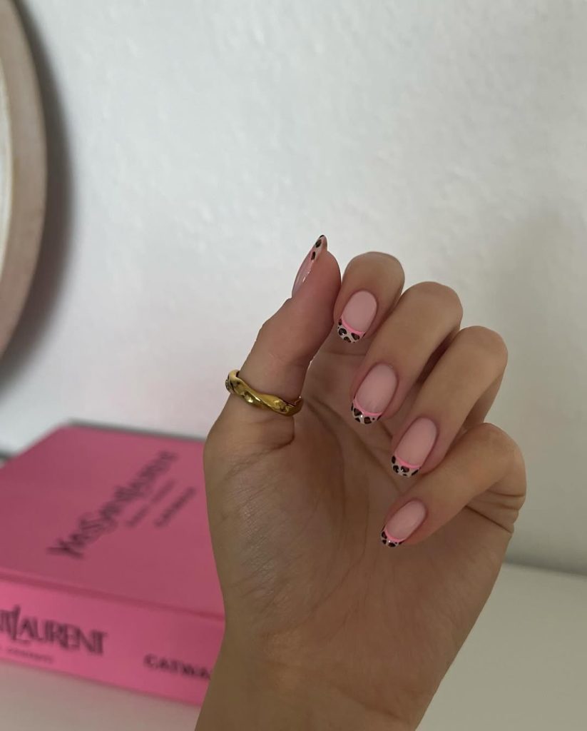 There is a soft and romantic touch when it comes to this design. The reason is that this design incorporates a pale pink background and small leopard spots. Therefore, this is a variation of a French tip that looks elegant and classy.