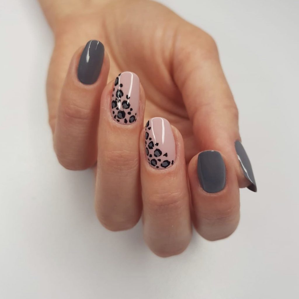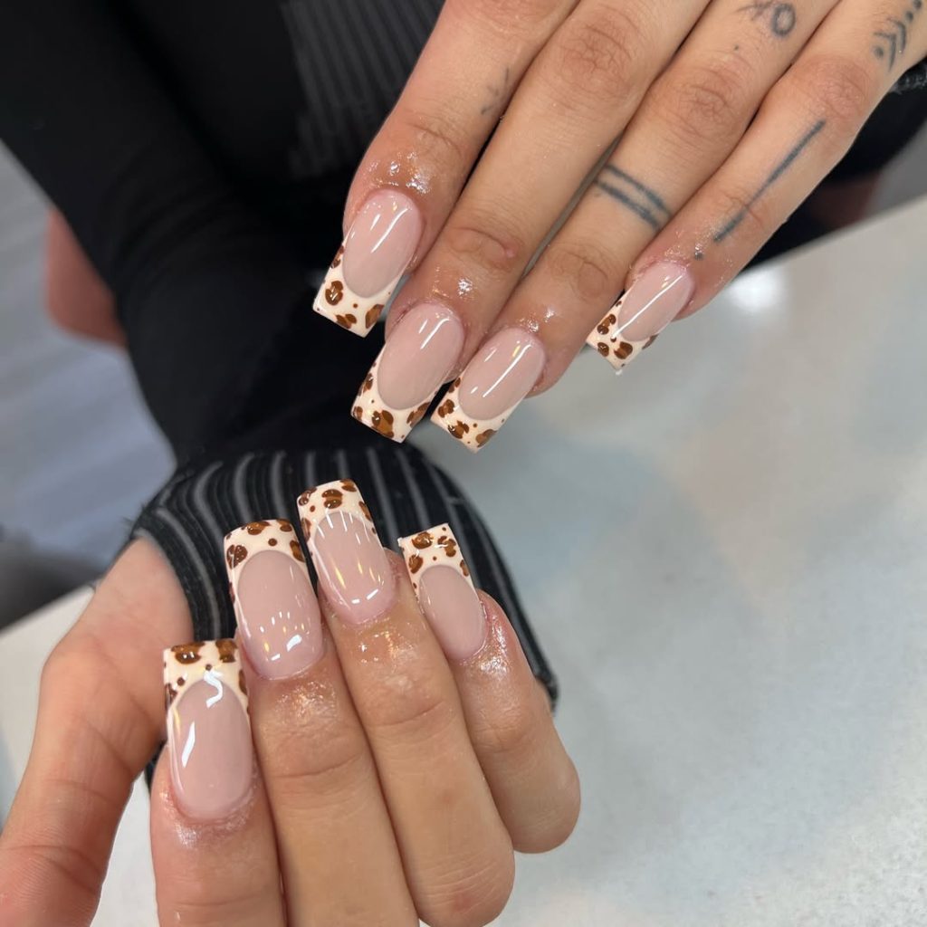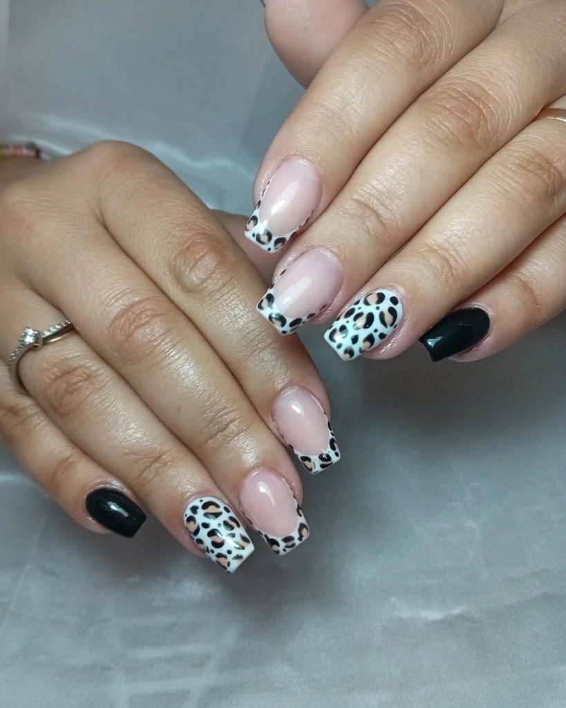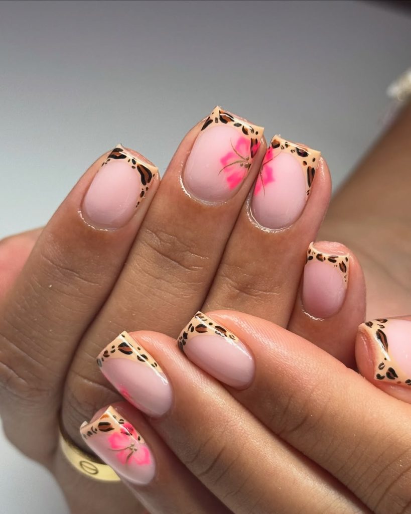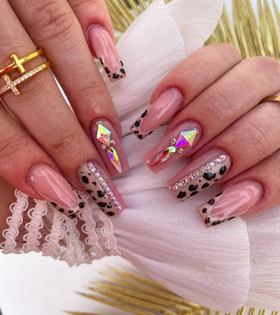 There is a soft and romantic touch when it comes to this design. The reason is that this design incorporates a pale pink background and small leopard spots. Therefore, this is a variation of a French tip that looks elegant and classy.