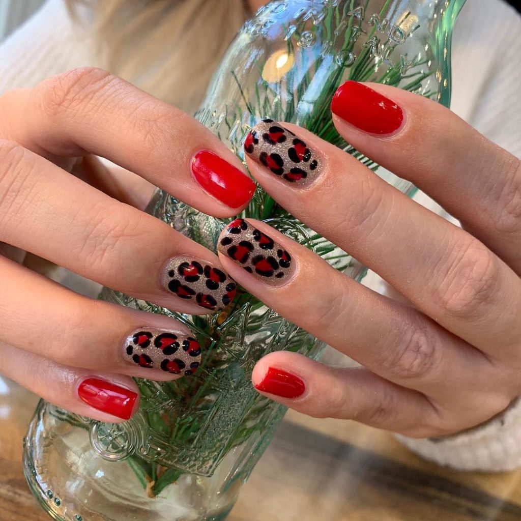 This design is perfect for those with shorter to medium-length nails and will look great with cozy sweaters or sparkly dresses. It’s actually a great tutorial for those that love nails but want to add a touch of leopard print without going all out. To add a little more personality to this look, add some glitter and/or red gold to give it that warmth.