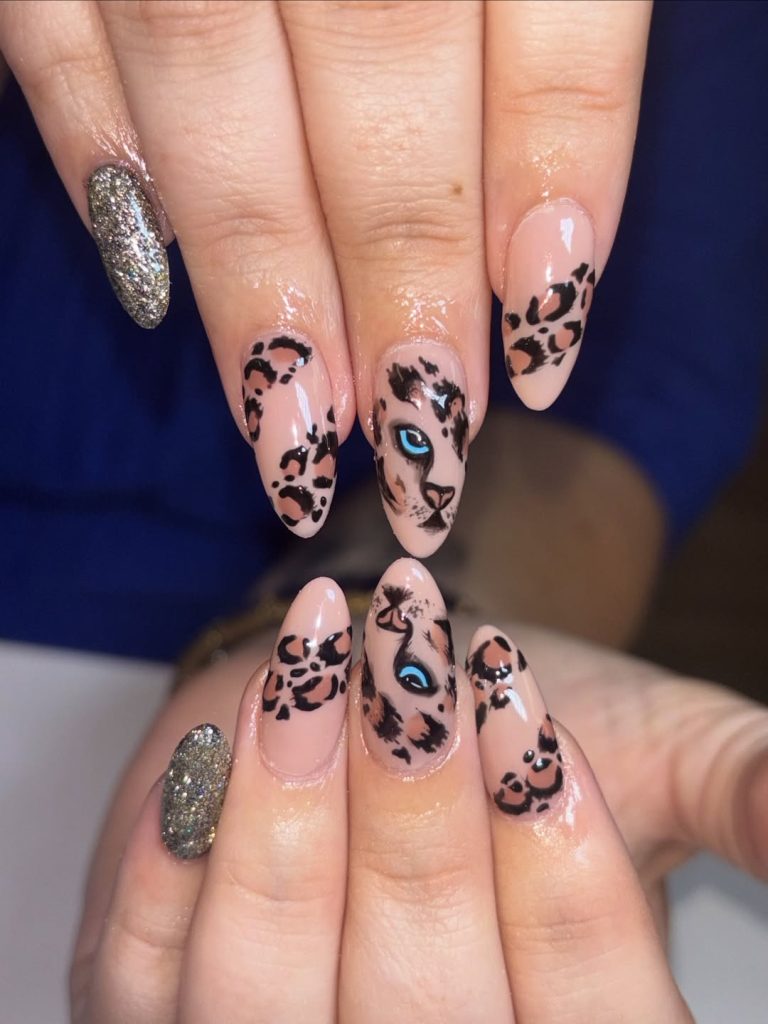 This design perfectly matches almond-shaped nails and is a great choice for a fun night out. It is ideal to wear when you are making a metallic and/or sequined appearance and will really make your nails stand out with its iridescent glitz in every leopard spot. It is a bold but classy choice.
