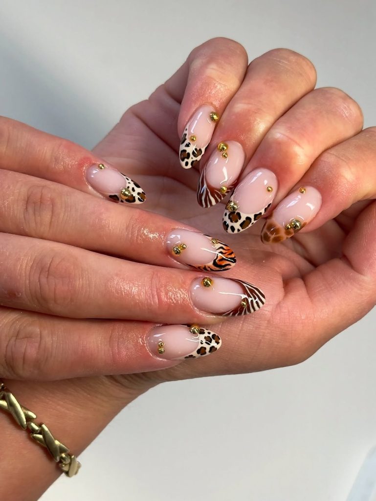 This manicure blends multiple animal prints with gold accents for a truly glamorous finish. The mix of leopard, zebra, and tiger stripes keeps things interesting, while small gold studs add a touch of edge. It’s wild, daring, and full of personality.