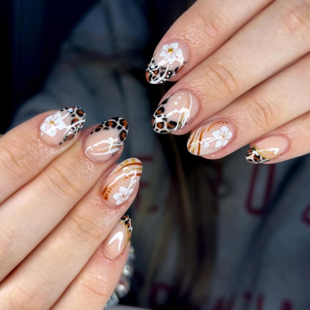 Leopard patterns are given a more feminine twist with white flowers. There is a mix of fierce and feminine here that really works well with animal prints and a hint of gold strips. This design is best for almond nails, where the artwork can shine.