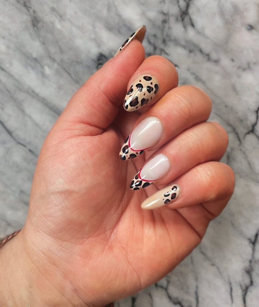 The design features a variation of the classic French tip manicure that has a touch of leopard patterns and fine red lines. The design is sophisticated and elegant while exuding a fun vibe. The contrast of bare nails with spotted tips is very trendy and chic.