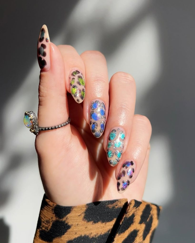 Sparkle meets wild with these glitter leopard nails. The base stays sheer and natural, while the spots shimmer in shades of green, blue, and purple. It feels glamorous, artistic, and perfect for anyone who loves their nails to double as jewelry.
