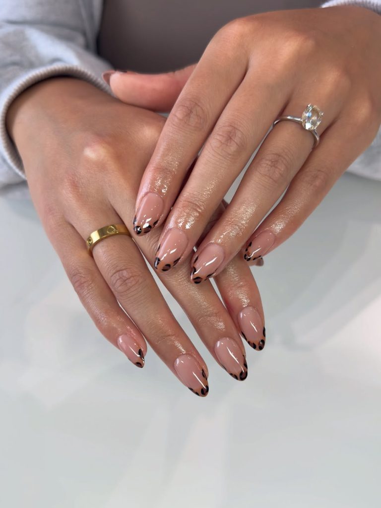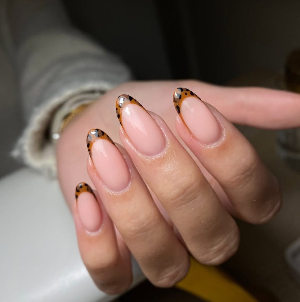 These nails blend the chic look of tortoise shell with a leopard-inspired French tip. The glossy nude base makes the dark and amber spots stand out, giving a polished yet bold finish. It’s subtle enough for everyday wear but stylish enough to feel special.