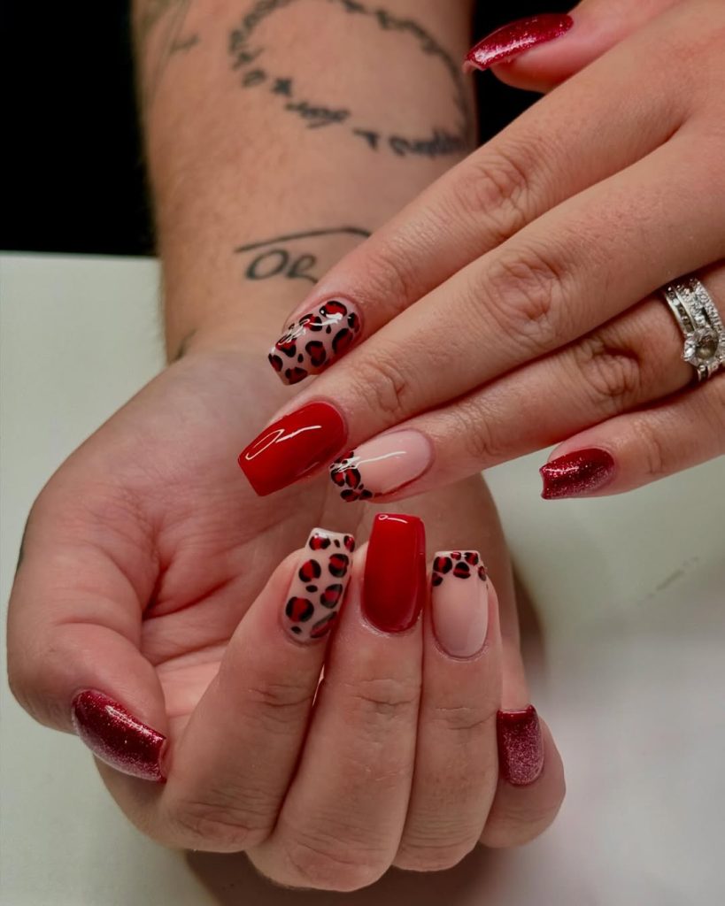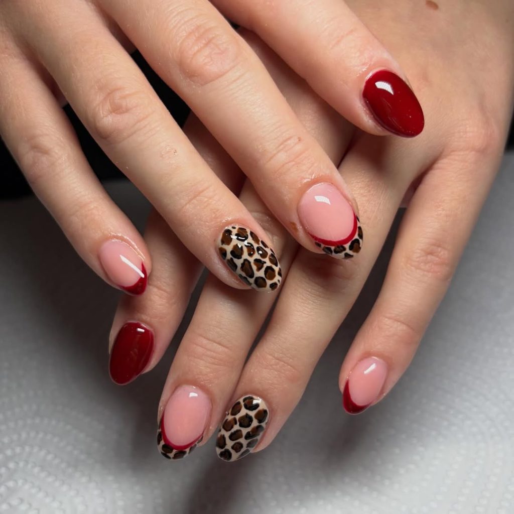 Red polish and leopard print are always a winning duo. Here, glossy red nails are balanced with nude bases featuring red French tips and full leopard print accents. The result is fierce, confident, and a little playful.