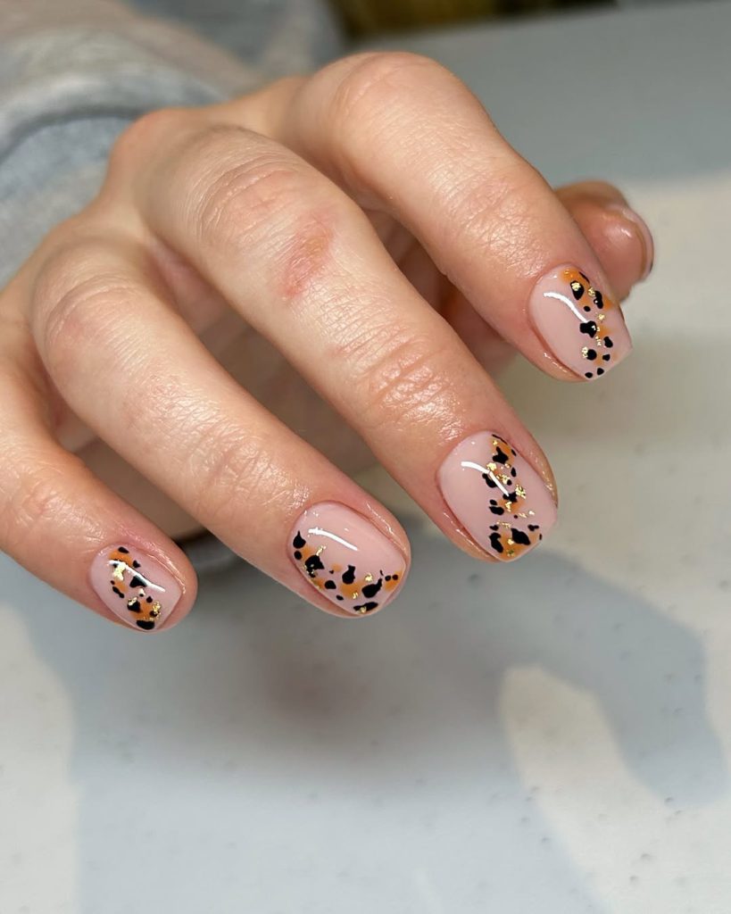 Short nails get a moment in this fashion, as this design features a minimalist leopard French tip. The natural matte finish and small leopard spots add to this look and give it a chic and contemporary feel. It shows that you can achieve a stylish look without making your nails long.