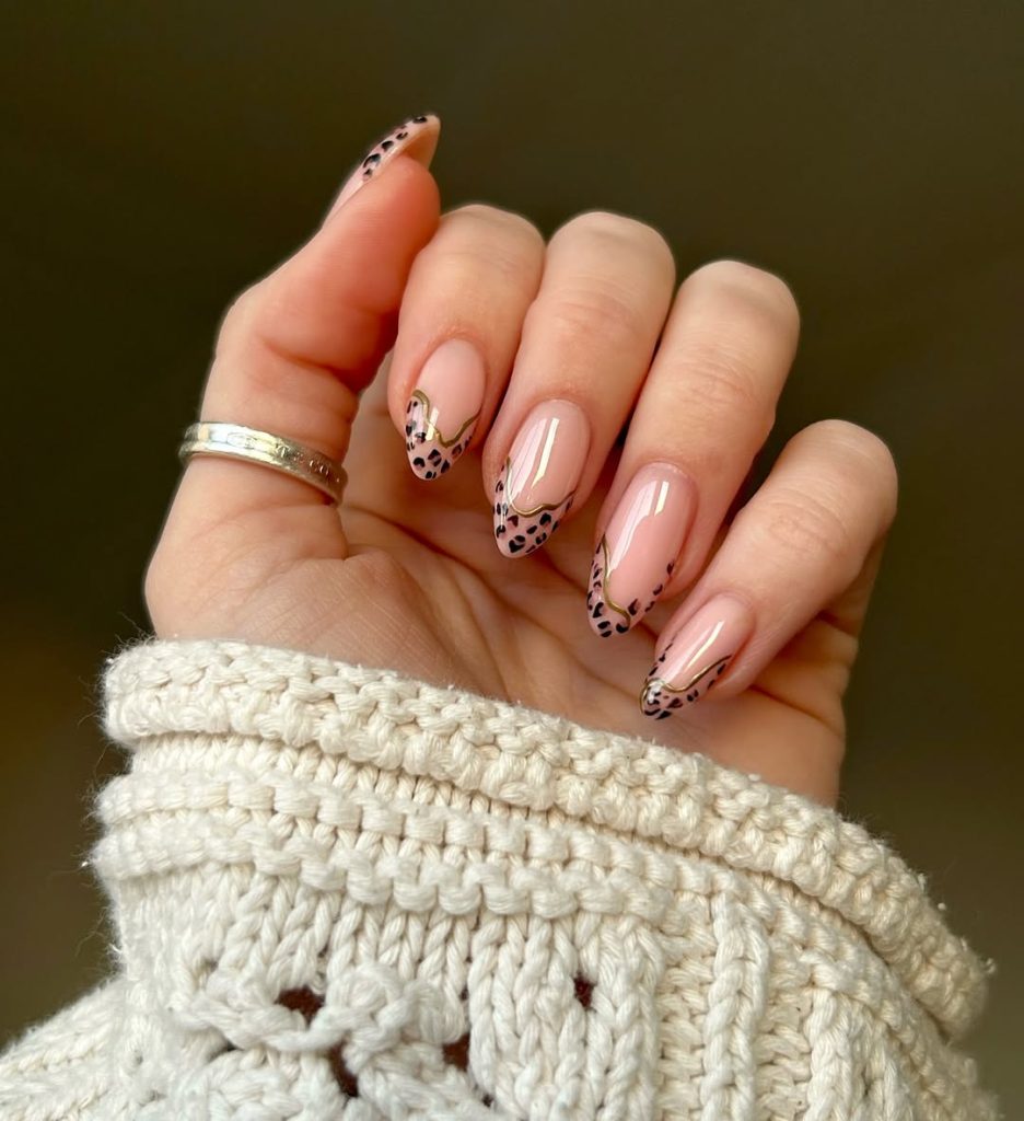 Why stick to one look when you can have it all? This manicure combines leopard accents with abstract gold outlines, dark tips, and glossy nude bases. It’s eclectic, artistic, and full of personality, like wearing statement jewelry right on your nails.