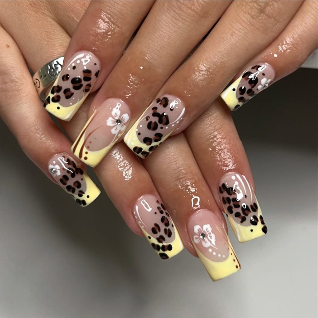 If leopard print could smile, it would look like this. Bright yellow tips decorated with leopard spots and dainty flowers make the whole manicure pop with cheer. It feels playful, fun, and a little bit unexpected—the kind of nails that instantly lift your mood.